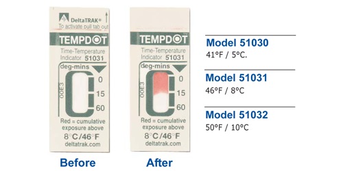 DeltaTrak提供滿足你各種需要的標(biāo)簽:WarmMark溫度標(biāo)簽、高溫?zé)針?biāo)簽和TempDot時(shí)間溫度指示標(biāo)簽顯示溫度變 化超過(guò)預(yù)設(shè)的時(shí)間。FreezeCheck和ColdMark溫度標(biāo)簽用于顯示運(yùn)輸溫度低于0℃。商業(yè)洗碗機(jī)使用的TempDot高溫?zé)針?biāo)簽可顯示最終沖 洗水溫是否達(dá)到71℃(HACCP體系所要求的溫度)。 TempDot時(shí)間溫度標(biāo)簽,,型號(hào)51030-51032,,是一種低成本的標(biāo)簽,,可顯示溫度高于閾值長(zhǎng)達(dá)60分鐘。當(dāng)溫度超過(guò)臨界值,,標(biāo)簽顏色變化開(kāi)始,,但溫度下降到閾值之下時(shí),,標(biāo)簽顏色變化停止,如此來(lái)顯示累積溫度超過(guò)的時(shí)間-,,對(duì)于許多質(zhì)保應(yīng)用來(lái)說(shuō),,度分鐘是非常的重要的概念。有三種溫度閾值5℃、8℃和10℃可供選擇。 這個(gè)低成本標(biāo)簽可以指示一段長(zhǎng)到60分鐘暴露在臨界點(diǎn)溫度。