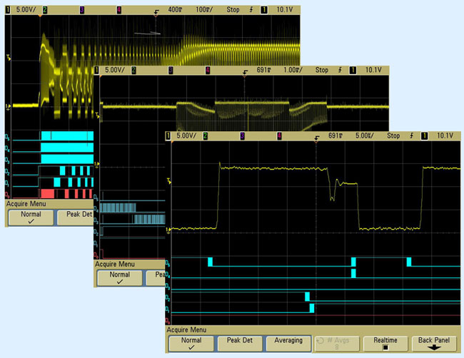 圖5. 由數(shù)字控制信號(hào)觸發(fā)的馬達(dá)驅(qū)動(dòng)信號(hào)起動(dòng)序列,以及用Agilent 6000系列MSO不同級(jí)別的放大展現(xiàn)“矮”脈沖