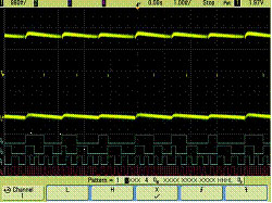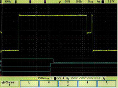 當(dāng)您觀察復(fù)合調(diào)制模擬信號(hào)如前述組合電視信號(hào)和馬達(dá)驅(qū)動(dòng)信號(hào)時(shí)數(shù)字示波器亮度分級(jí)能力具有鮮明的視覺效果。在您調(diào)試數(shù)字電路時(shí),亮度等級(jí)對(duì)于發(fā)現(xiàn)信號(hào)異常也極端重要。圖6是發(fā)現(xiàn)嵌入在脈寬調(diào)制信號(hào)(PWM)中矮脈沖的例子。靠近各突發(fā)中心處的亮點(diǎn)表明示波器已捕獲到信號(hào)異常。通過在一個(gè)亮點(diǎn)上放大我們能清楚看到如圖7所示的信號(hào)異常細(xì)節(jié)。雖然模擬示波器也能通過重復(fù)掃描顯示亮點(diǎn)但模擬示波器不能保存和放大波形。