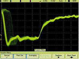 同樣由于不同時(shí)間的馬達(dá)起動(dòng)信號(hào)屬單次應(yīng)用傳統(tǒng)模擬示波器技術(shù)也不能充分捕獲和顯示這些波形。把一臺(tái)模擬示波器設(shè)置為以100ms/div掃描捕獲單次信號(hào)您會(huì)觀察到一條垂直光帶在一秒內(nèi)掠過示波器顯示。由于傳統(tǒng)模擬示波器沒有存儲(chǔ)能力因此放大保存波形是不可能的。