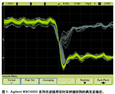 圖1 是用 Agilent's 6000 系列示波器捕獲到的毛刺該示波器甚至能在帶sin(x)/x重建時用實時采樣達到100,000 次/ 秒的波形更新。在這一更新率下示波器捕獲到該特用實時采樣捕獲亞穩(wěn)態(tài)定信號的統(tǒng)計概率約為每秒二次。采用專有MegaZoom III 技術的Agilent示波器實現(xiàn)了這一業(yè)內(nèi)領先的更新率。