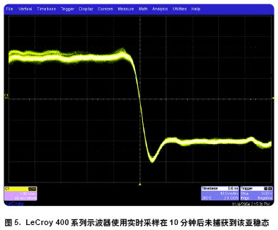 圖5是嘗試用LeCroy WaveSurfer400 系列示波器默認的實時采集模式捕獲同樣的異常事件。由于在此時基設置下示波器的實時更新率僅165 波形/ 秒把探頭放在測試點上10 秒后我們未捕獲到任何異常。為使用LeCroy WaveSurfer示波器捕獲該毛刺需要在該測試點上探測將近5 分鐘。