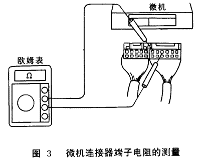 。3)如圖 3所示用萬用表歐姆檔測量導(dǎo)線連接器各端子間電阻值(注意:不要觸碰微機(jī)的接線端子應(yīng)將測筆從導(dǎo)線側(cè)插入導(dǎo)線連接器中)。
