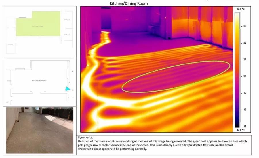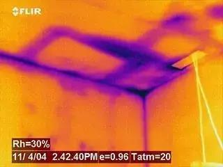 一個(gè)典型的實(shí)例是尋找地板加熱系統(tǒng)發(fā)生滲漏的位置。在紅外熱像儀的幫助下加熱系統(tǒng)的滲漏點(diǎn)可以被檢修人員發(fā)現(xiàn)并及時(shí)維修。精確確定滲漏點(diǎn)位置可以避免不必要的開挖過程,節(jié)省開支。